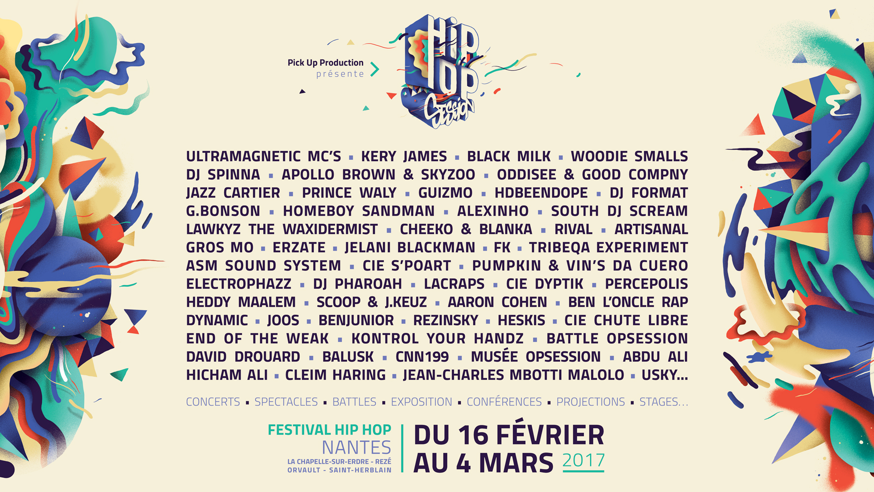 La programmation de la 13e édition du festival HIP OPsession est désormais bouclée. 29 groupes et artistes s’ajoutent à ceux déjà annoncés mi-novembre. Du 16 février au 4 mars 2017, 53 événements seront proposés à Nantes et dans son agglomération. De Ultramagnetic MC’s à Jazz Cartier, de Kery James à Prince Waly, les artistes programmés représentent ces générations qui se croisent, s’entrechoquent et contribuent à l’effervescence de la culture hip hop.